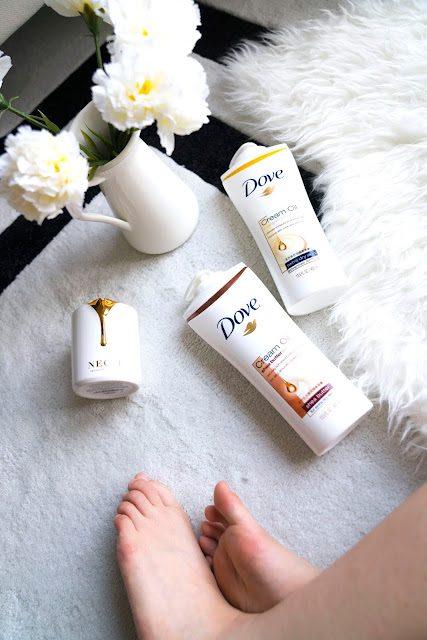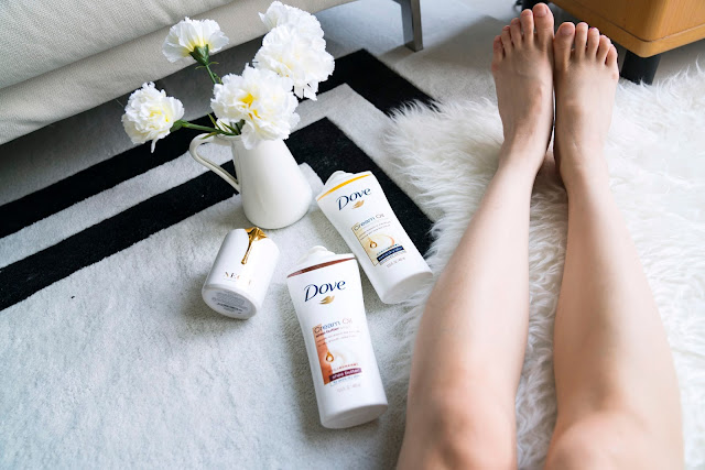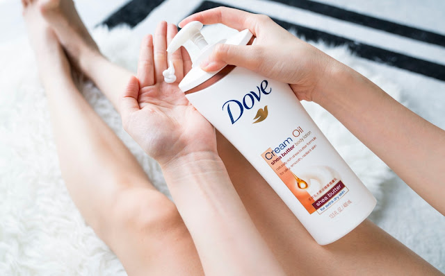 就我之前擦過的乳木果油類似的乳液,我都會覺得好油,但是多芬擁有獨特的科技,將美容油/乳木果油跟他們家著名的多芬潤澤乳霜結合,塗抹在肌膚上吸收一陣子後, 算是還滿清爽的呢。跟剛剛的美容油精華潤膚乳一樣都是很細緻的塗抹觸感,適當的油份真的可以讓腿很美很美