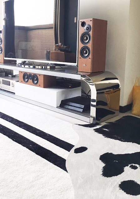 但是我們東西蠻多的,也沒有多餘的閒錢換客廳的環繞視聽音響哈哈,所以你看到照片呈現了一個材質組合有點複雜的畫面~但後來想想也覺得沒差,反正只是先租房子,音響以後還可以再看再橋。至少現在有了電視櫃不會讓電線亂噴就很感動了啦,爽TAT